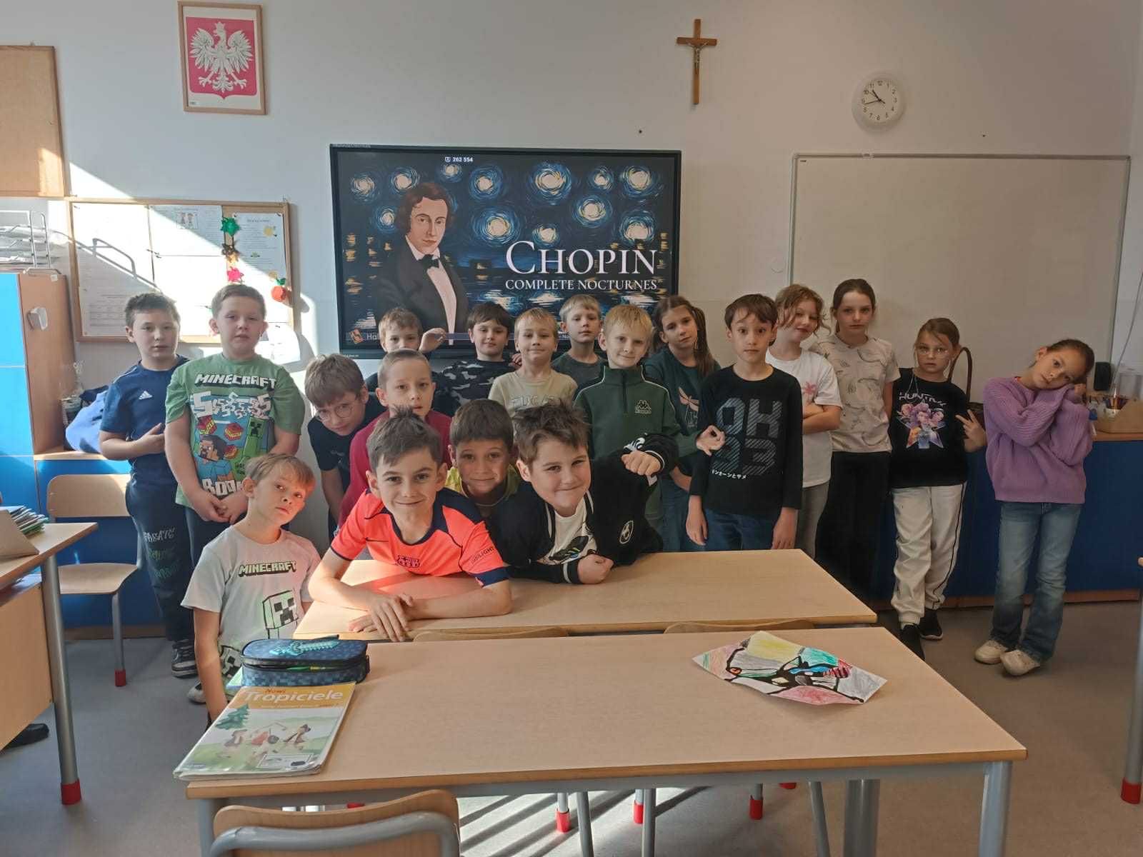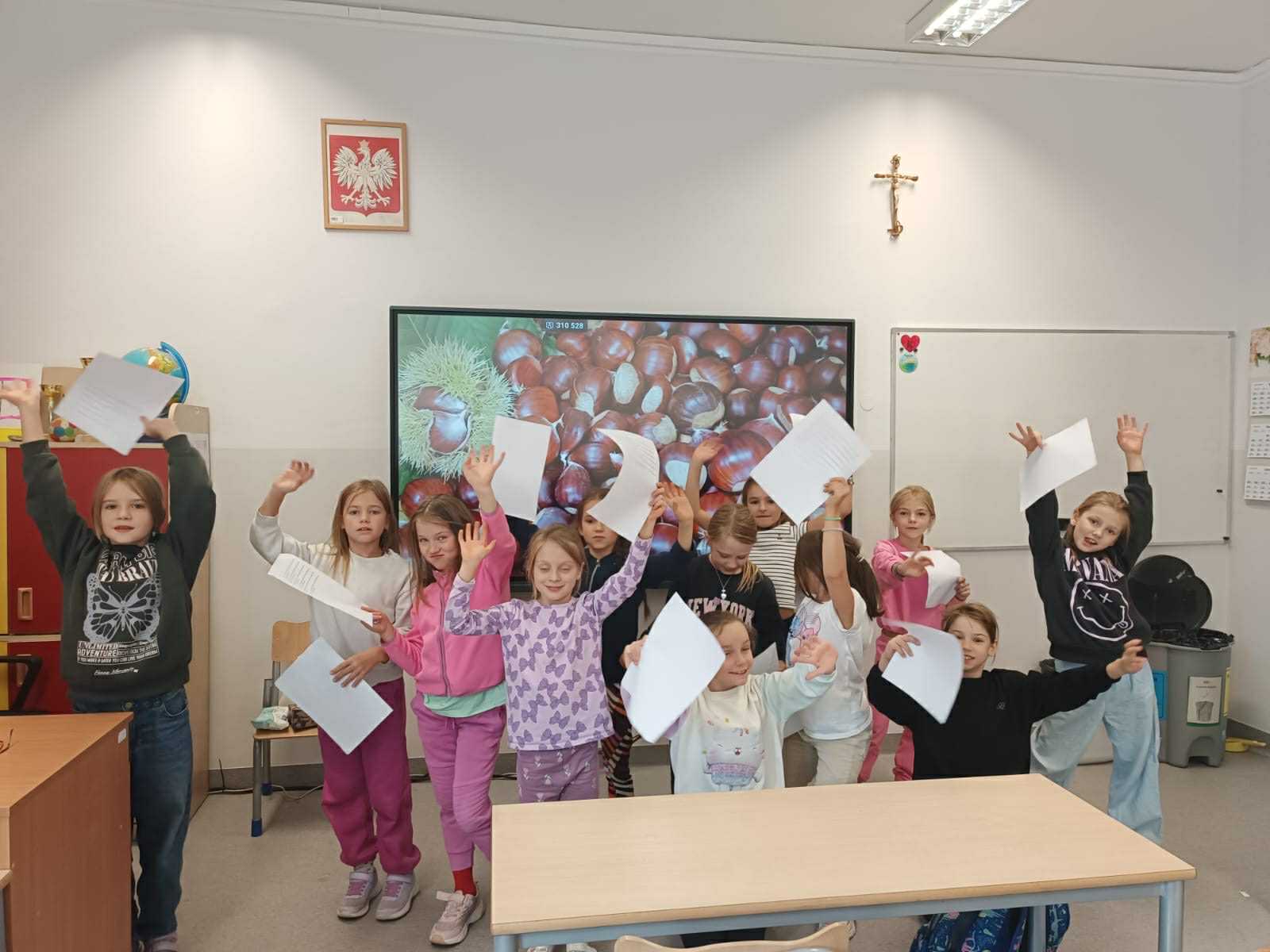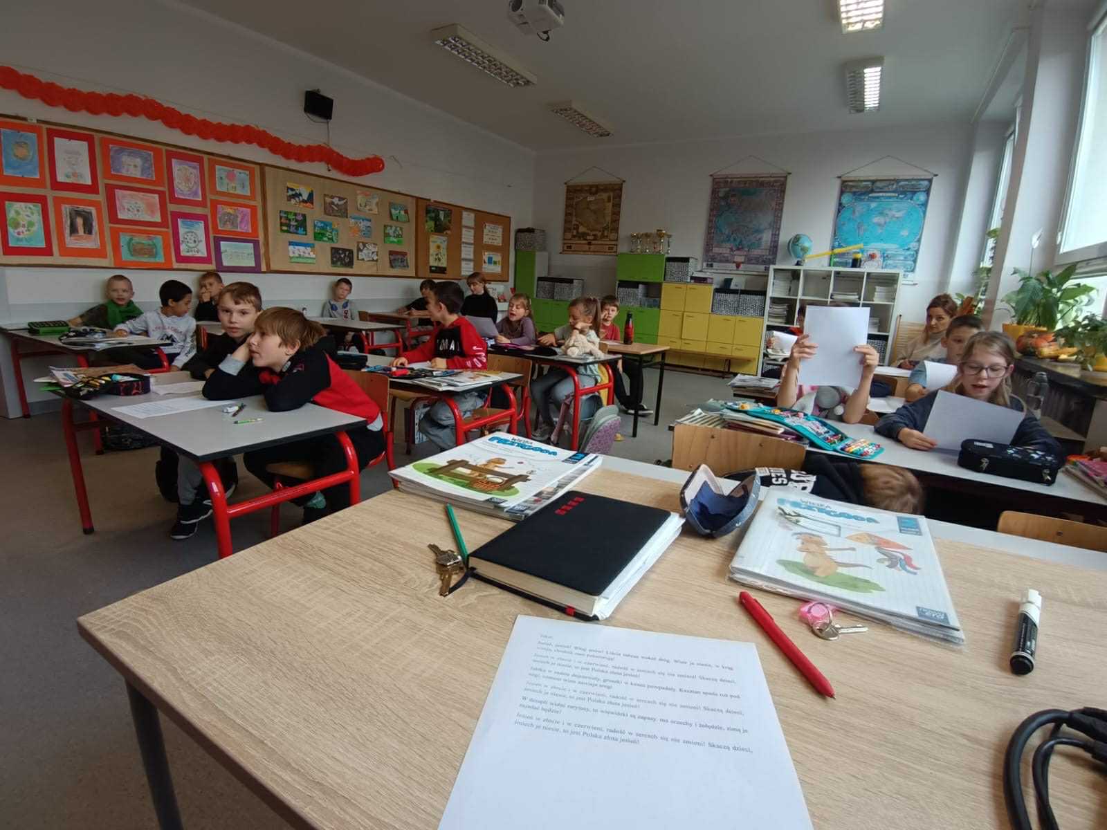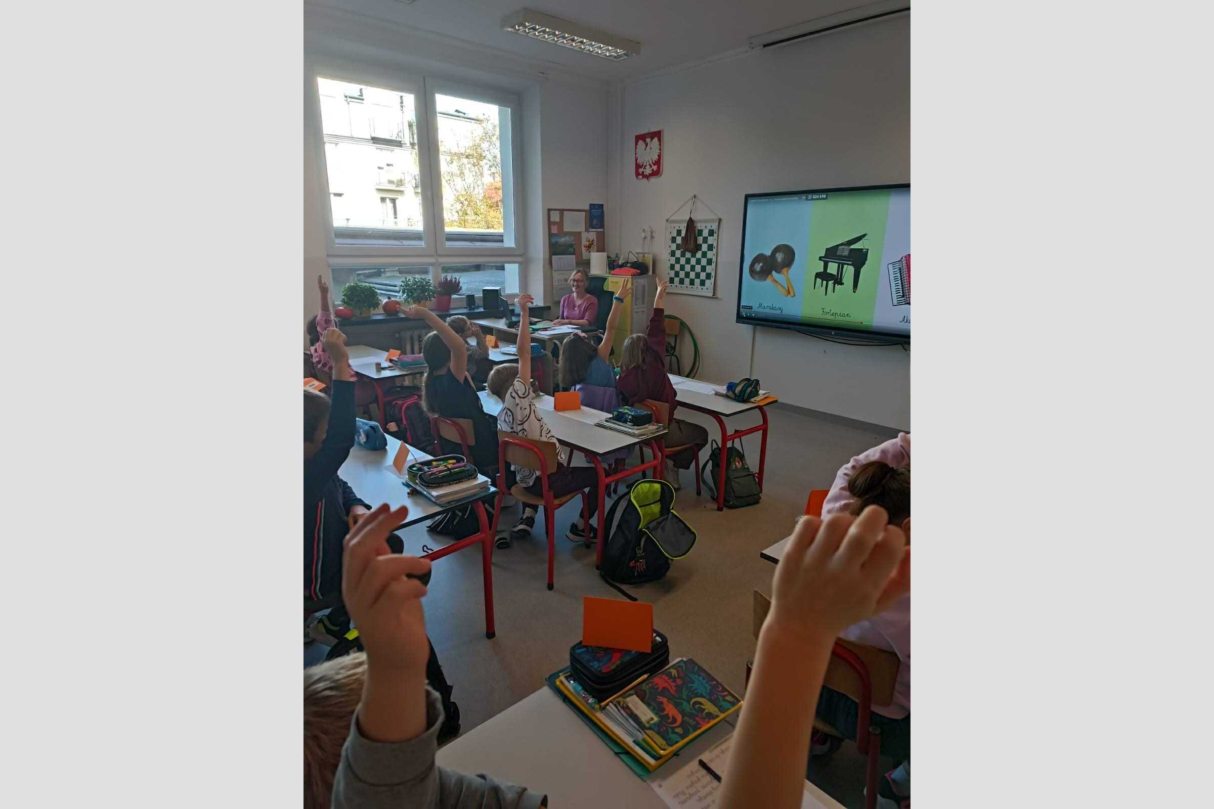 Z klasami 2-3 poznaliśmy nazwy nut 🎶 i ich położenie na pięciolinii 🎼. Zagraliśmy w "Zabawy dźwiękowe" i "Echo rytmiczne". Dowiedzieliśmy się, jak brzmi muzyka z różnych stron świata 🌏. Na koniec zaśpiewaliśmy piosenkę o różnobarwnej jesieni 🍁. To była dobra możliwość dla wszystkich, by podzielić się wiedzą i doświadczeniami muzycznymi.